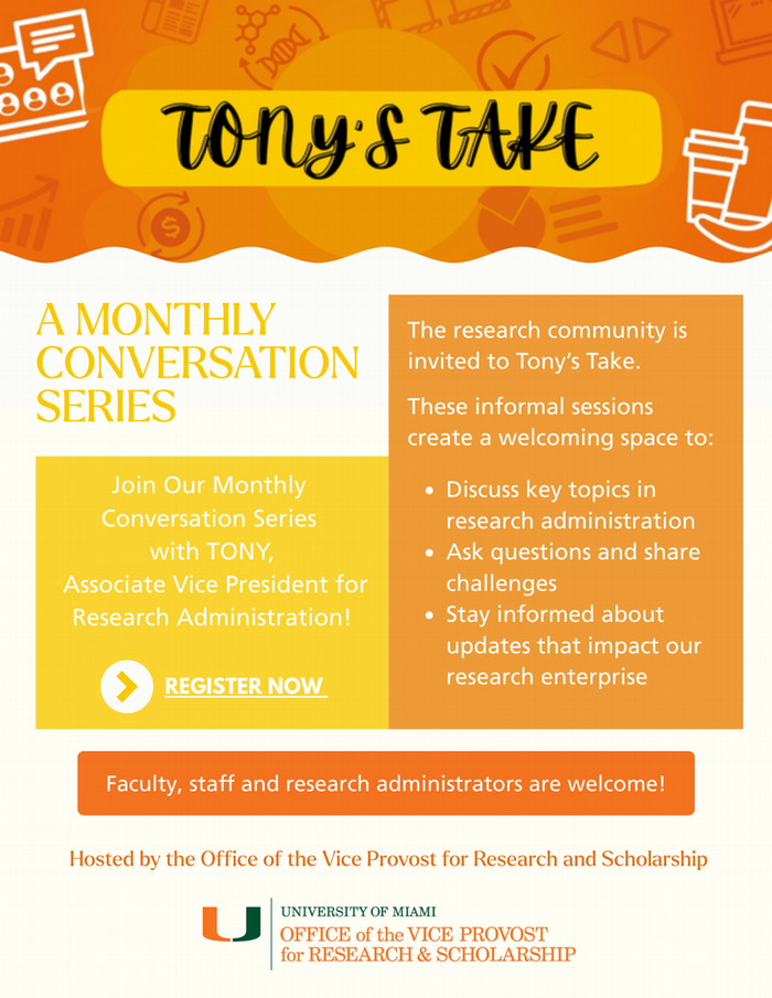 Join the Associate Vice President for Research Administration, Tony Carna, for this monthly conversation series.