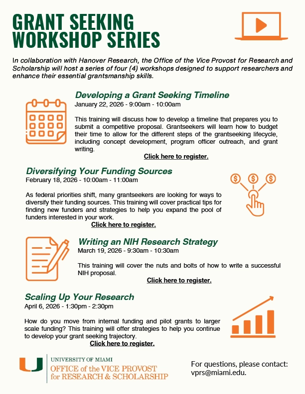 The Office of the Vice Provost for Research& Scholarship has apartnership with Hanover Research to provide grant support services for University of Miami faculty.